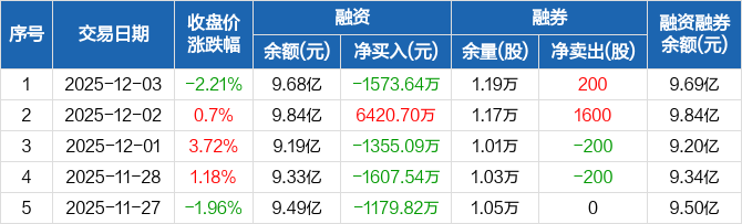 瑞可达融资融券信息显示,2025年12月3日融资净偿还1573.64万元;融资余额9.68亿元,较前一日下降1.6%。