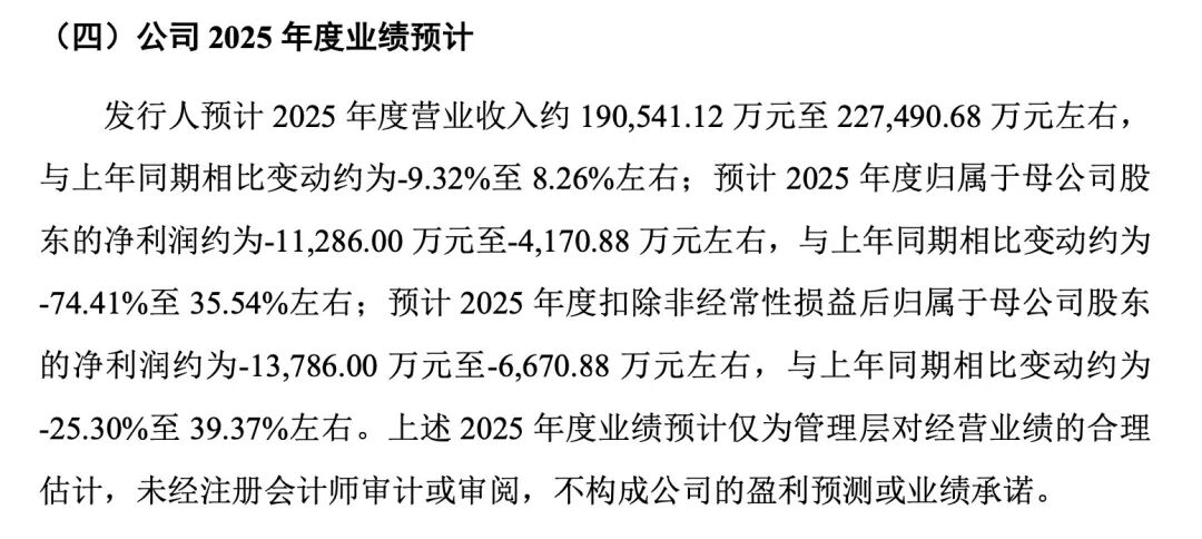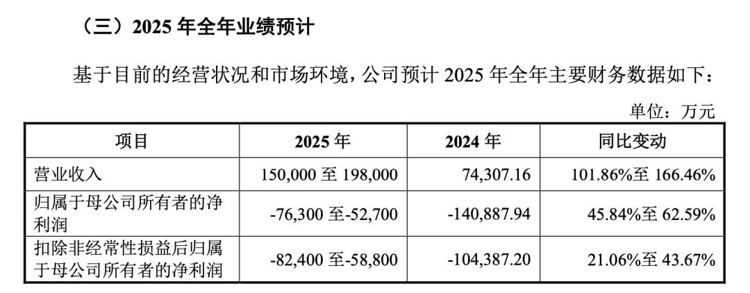 此外,公司还披露了2025年全年业绩预测,预计实现营业收入15亿元至19.8亿元,同比增长101.86%至166.46%;归母净利润-7.63亿元至-5.27亿元,同比增长45.84%至62.59%。