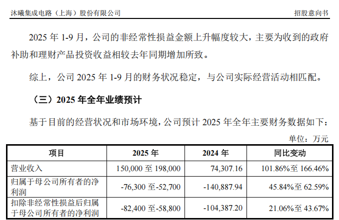 招股意向书显示,综合考虑AI智算行业下游市场需求持续旺盛,以及沐曦股份核心产品出货量大幅增长、在手订单充沛和成本费用预算规划等因素,沐曦股份预计其2025年全年的营业收入为15亿元至19.80亿元,同比增长101.86%至166.46%。