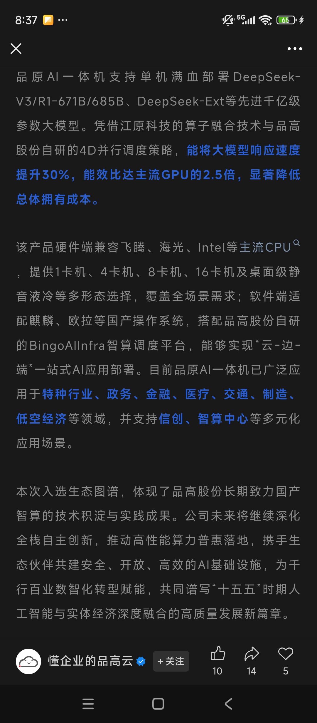 与江原科技双向持股绑定,联合推出的“品原AI一体机”性能突出,大模型推理效率提升