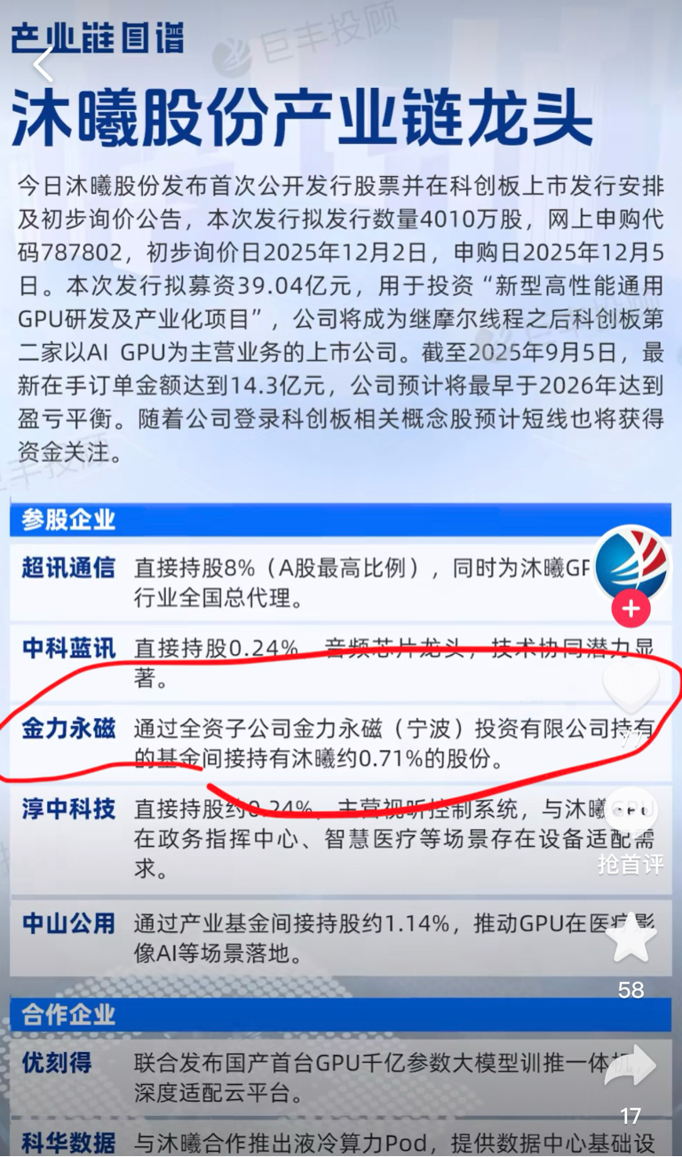 金力永磁:公司通过全资子公司金力永磁(宁波)投资有限公司持有中小企业发展基金(成都)交子创业投资合伙企业(有限合伙)1%的投资份额。根据公开信息披露,该基金目前持有沐曦集成电路(上海)股份有限公司0.71%的股份。