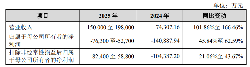 基于公司已实现业绩情况,综合考虑AI智算行业下游市场需求持续旺盛、公司核心产品出货量大幅增长、在手订单充沛以及成本费用预算规划等因素,沐曦股份预计2025年全年实现营业收入15亿元至19.8亿元,相较于2024年增幅为101.86%至166.46%;归属于母公司所有者的净利润为-7.63亿元至-5.27亿元,相较2024年减亏幅度为45.84%至62.59%。根据公司给出的前瞻测算,沐曦股份将最早于2026年达到盈亏平衡。