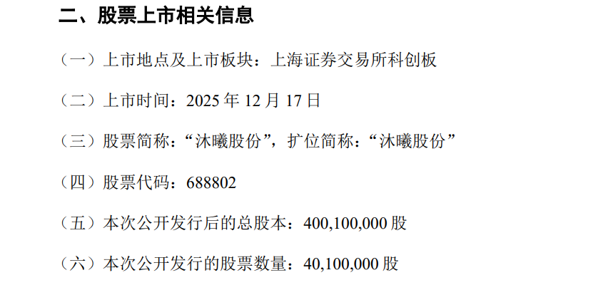 12月15日,沐曦股份发布公告称,公司股票将于2025年12月17日在上海证券交易所科创板上市,股票代码为688802,首次公开发行后总股本约4亿股,发行股票数量为4010万股,占发行后总股本的10.02%,全部为公开发行新股。