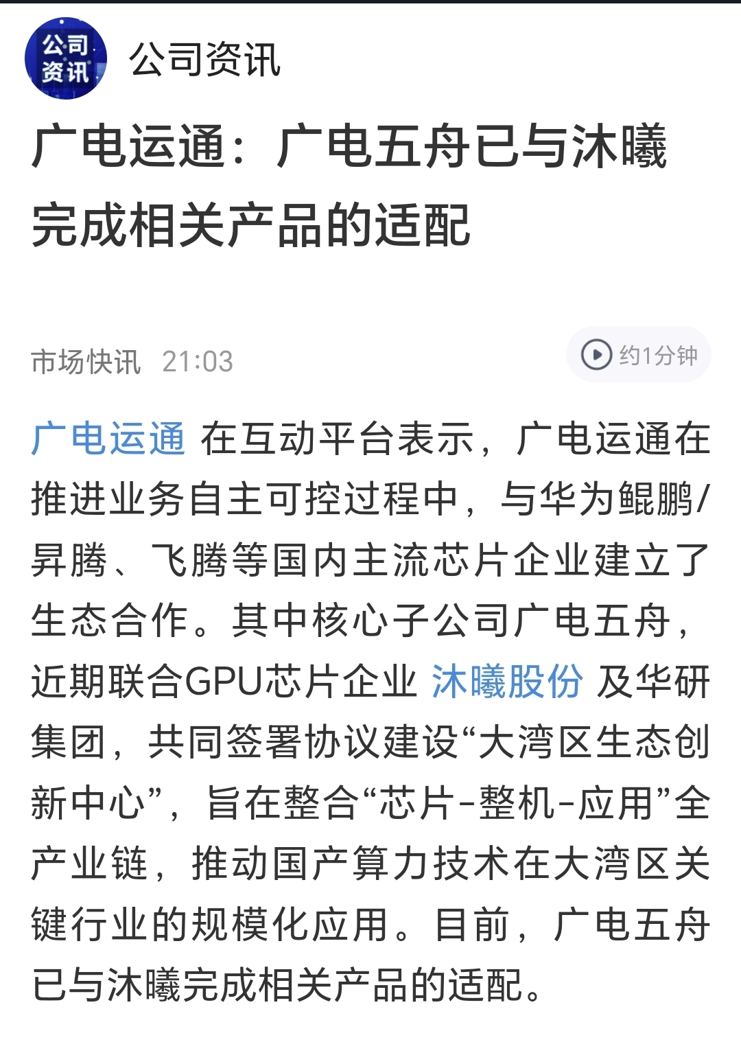 广电运通:广电五舟已与沐曦完成相关产品的适配