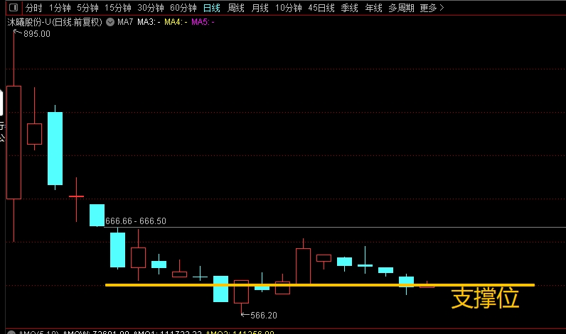 $沐曦股份-U(SH688802)$ 次新股,不好判断,整体来看上市后冲高后逐步回落下来,走震荡回落的趋势,短期来看,我们主要是关注横线位置的支撑位得失,能稳住就还能看震荡横盘,兜不住就要考虑继续回落调整的趋势了,整体形态不合适重仓参与,谨慎应对。#炒股日记# #周度策略#