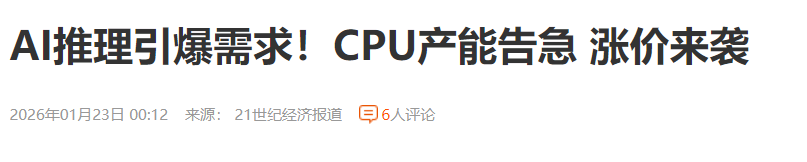 世纪经济报道:AI推理引爆需求!CPU产能告急涨价来袭
