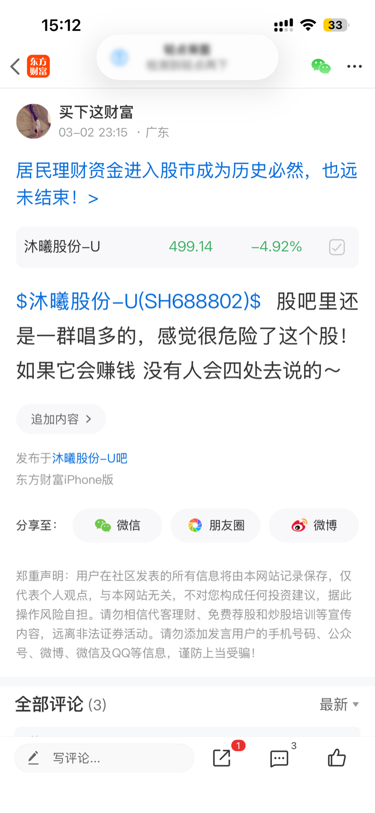 $沐曦股份-U(SH688802)$ 上个帖子都不让发了!昨天提醒了说看情况不太妙,一是股吧里,一群小号在唱多,二是大盘迟迟不突破,那就要向下找底。熊市要来了,大家理性一些吧……