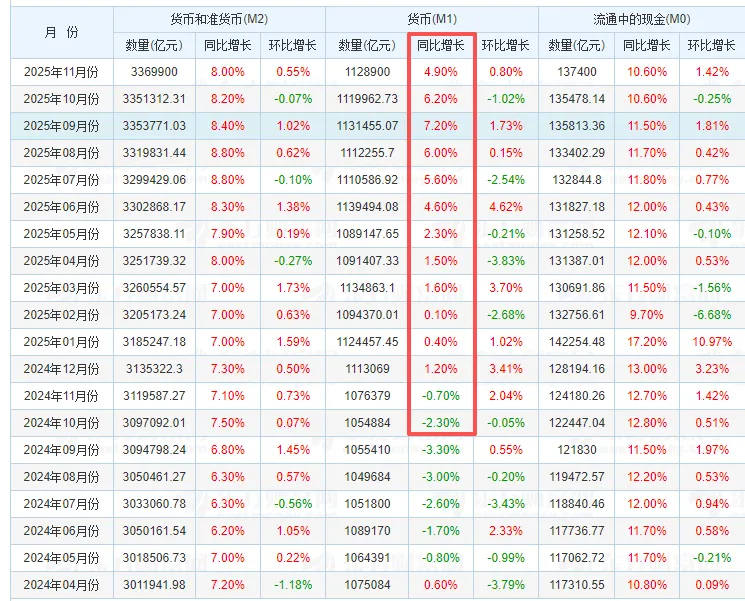 11月份,M1增速4.9%,较10月份再度下降1.3个百分点。