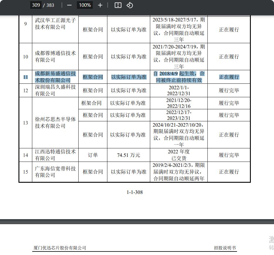 优迅2018年起给新易盛供货的合同一直在履行,算达链吗?具体见优迅的招股说明书3