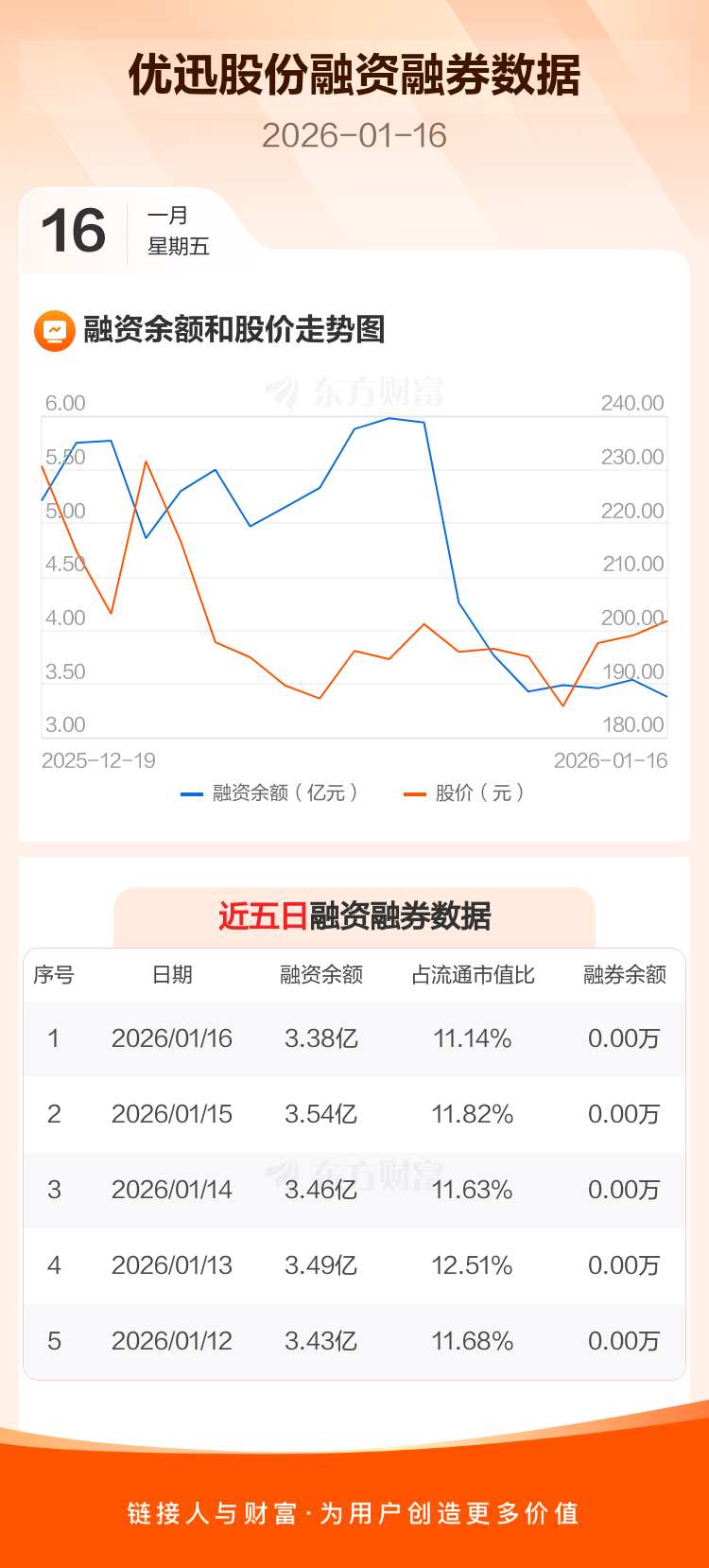 交易所最新数据显示,优迅股份于2026年1月16日获融资买入7969.64万元,融资偿还9523.32万元,当日融资净偿还1553.69万元。目前,该股融资余额3.38亿,占流通市值比例为11.14%。