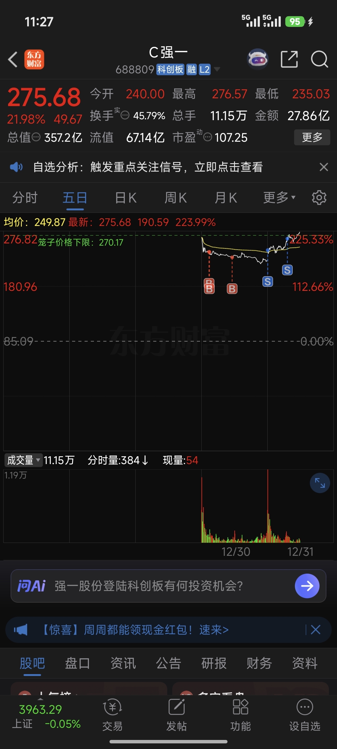 $C强一(SH688809)$ 目光短浅了,老师说320亿市值太贵了,昨天241接了1000股,231接了1000股,收盘亏了3万