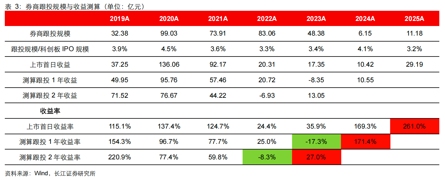 2025年,跟投业务全面回暖,不仅规模回升至11.18亿元,首日收益率更是攀升至261.0%,创下历年最高水平,收益也随之大幅增长。