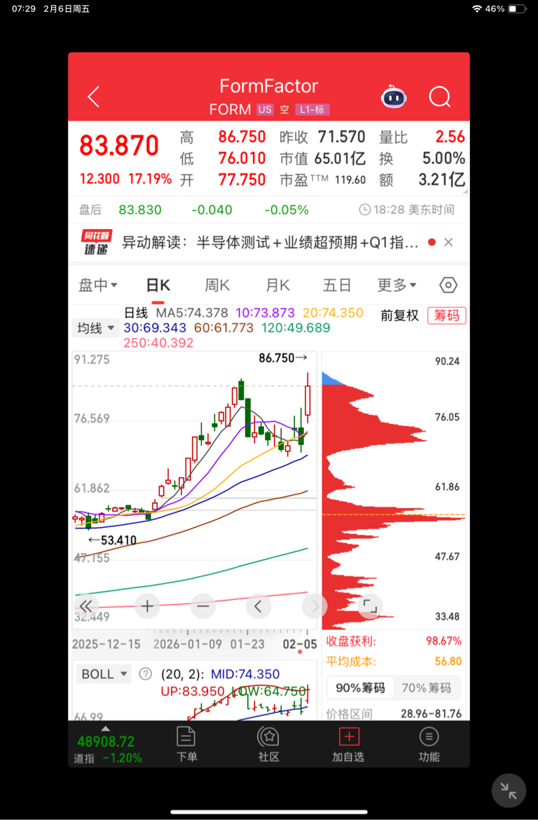 $强一股份(SH688809)$ $FormFactor Inc(NASDAQ|FORM)$ 美股探针龙头大涨 今天秒板了