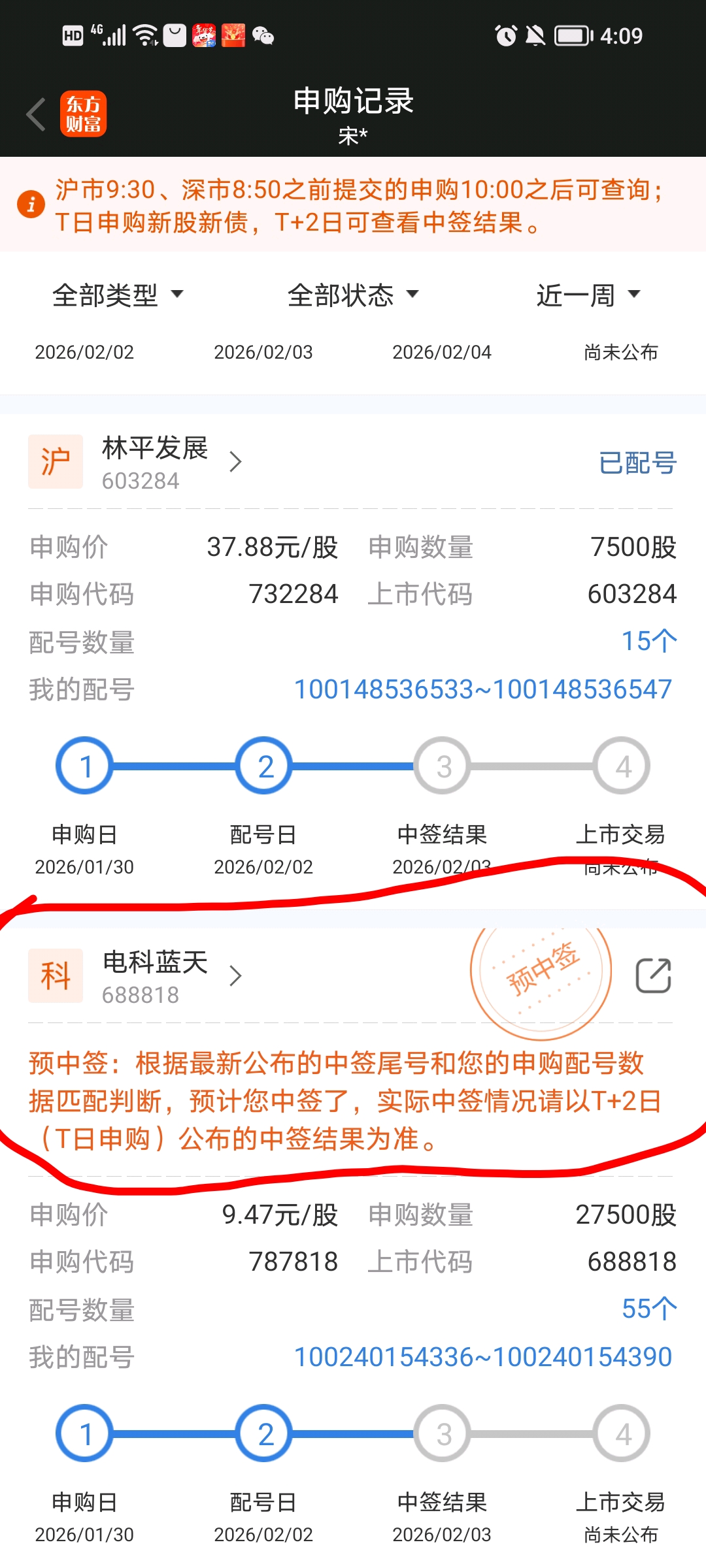 $电科蓝天(SH688818)$ 在这个好日子里,我中了一签,谢谢东财、谢谢我的运气!在以后的日子里更要多做善事,让幸运延续下去!