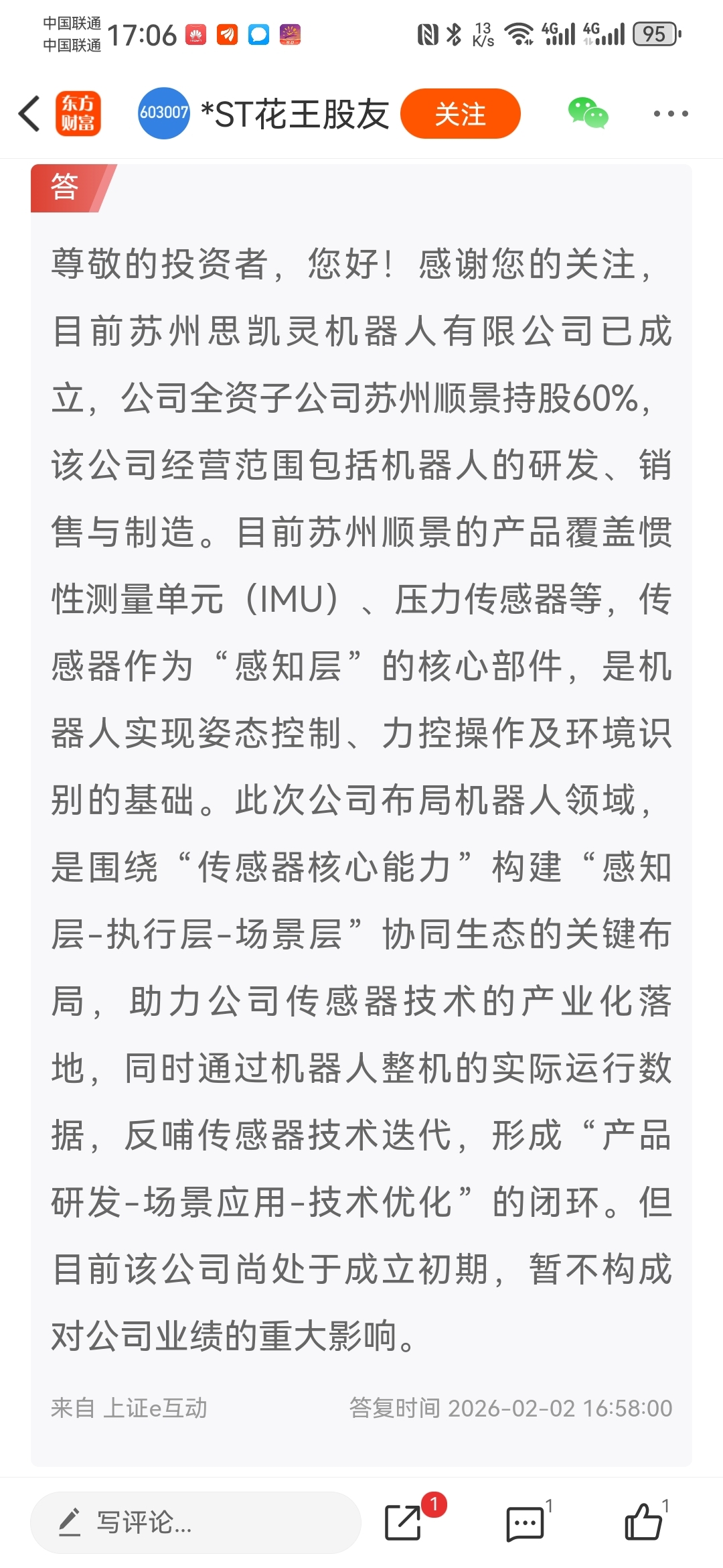 相关依据复制这句话:互动易回复成立思凯灵机器人,公司占股60%,是控股子公司,经营范围包括机器人的研发销售和制造!