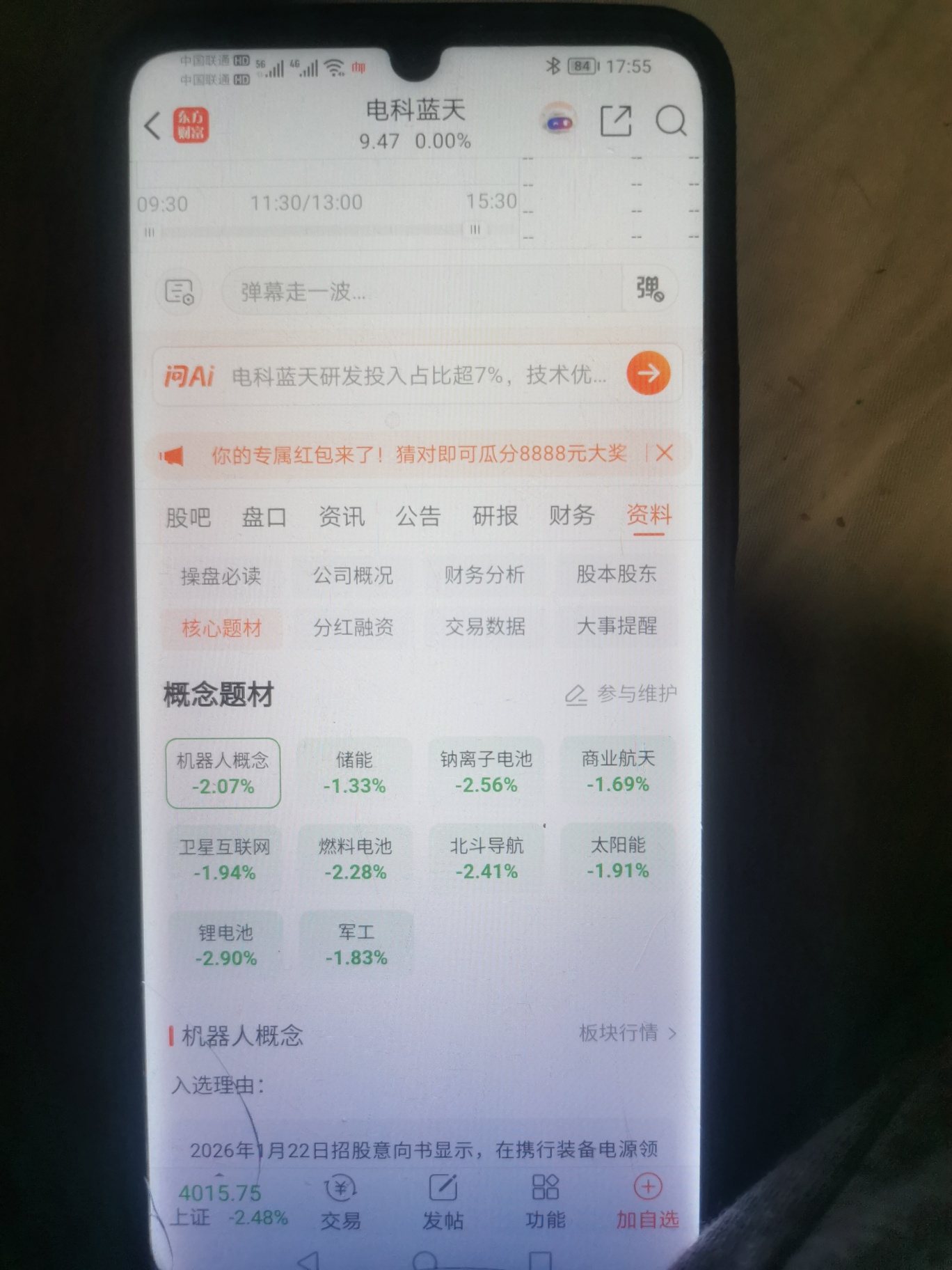 $电科蓝天(SH688818)$ $*ST花王(SH603007)$ $*ST铖昌(SZ001270)$ 花王和铖昌的家人们,大家沾沾牛哥的好运气,今年中的第一签。就是商业航天 机器人 军工 储能 卫星互联网,哪个概念拿出来都得爆炒!这公司电科蓝天代码也吉利,688818,发行价9.47,起码上市50 。
