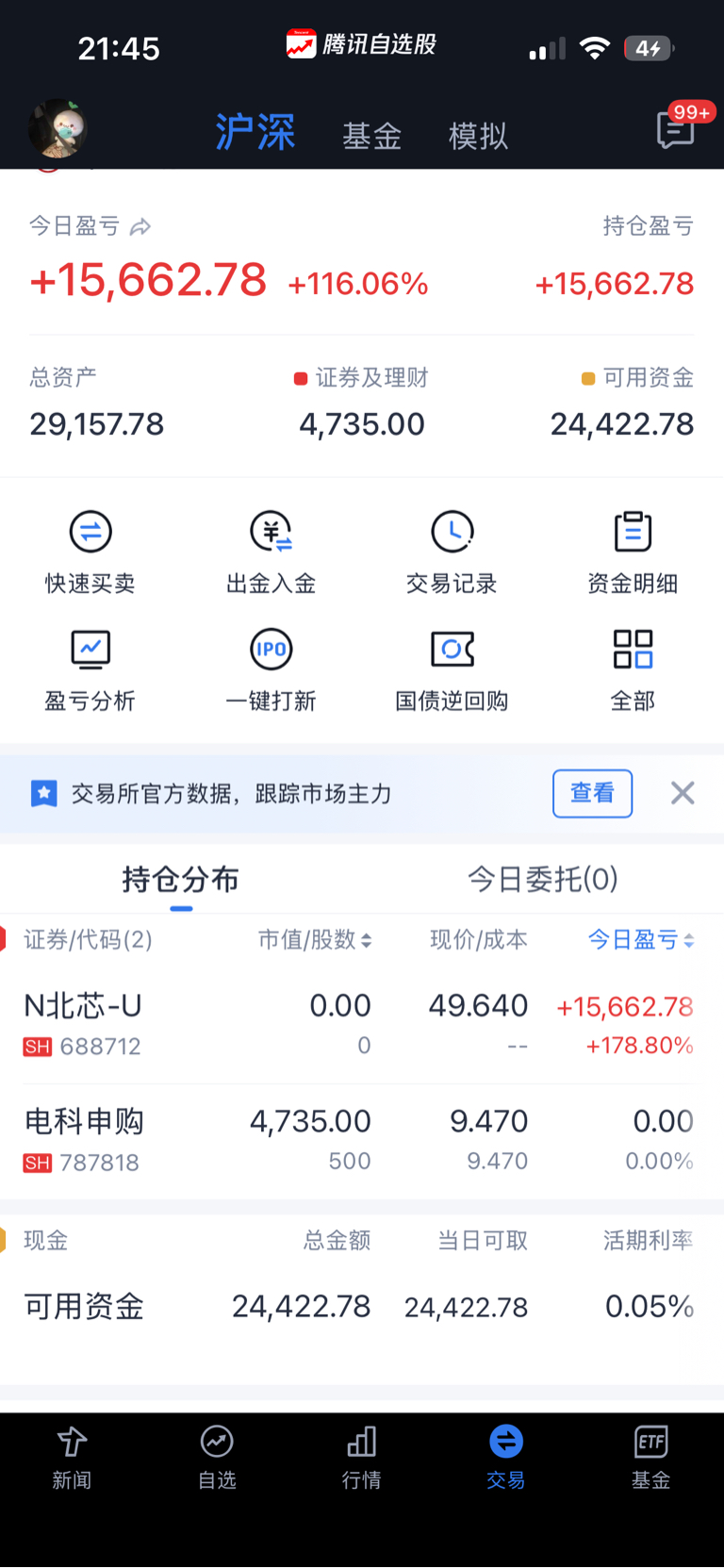$电科蓝天(SH688818)$ 这是我中签帐户,开20allin不太可能,北芯那么垃圾都180%了,开30以下我挂买500股,40买300股,跌到20当我没中过,开50以上可以11点不上去出,100以上当晚宰猪。我大概这样策略
