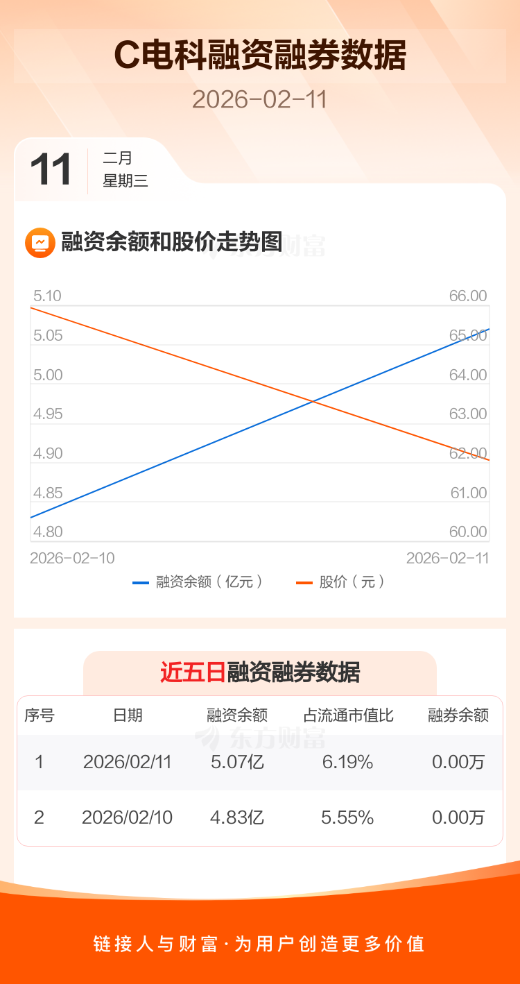 交易所最新数据显示,C电科于2026年2月11日获融资买入4.50亿元,融资偿还4.26亿元,当日融资净买入2390.41万元。目前,该股融资余额5.07亿,占流通市值比例为6.19%。