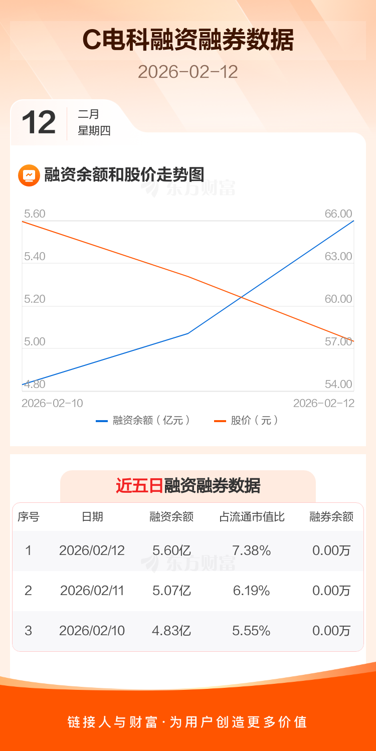 交易所最新数据显示,C电科于2026年2月12日获融资买入3.87亿元,融资偿还3.34亿元,当日融资净买入5294.63万元。目前,该股融资余额5.60亿,占流通市值比例为7.38%。
