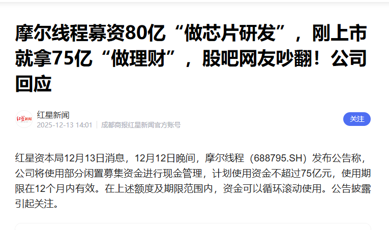 摩尔线程才募集80亿,拿去理财吵翻天!!!