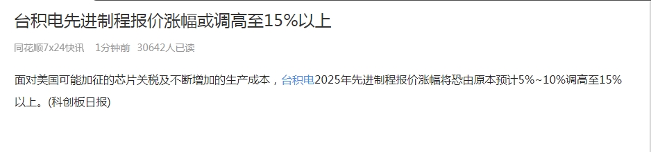 面对美国可能加征的芯片关税及不断增加的生产成本,台积电2025年先进制程报价涨幅将恐由原本预计5%~10%调高至15%以上。(科创板日报)
