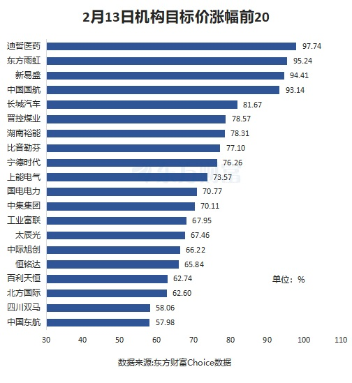 以近一月券商研报为样本,按机构目标价(有多家券商给出目标价的,取最大值)和最新收盘价相比,截至2月13日收盘,迪哲医药上涨空间最大,为97.74%。