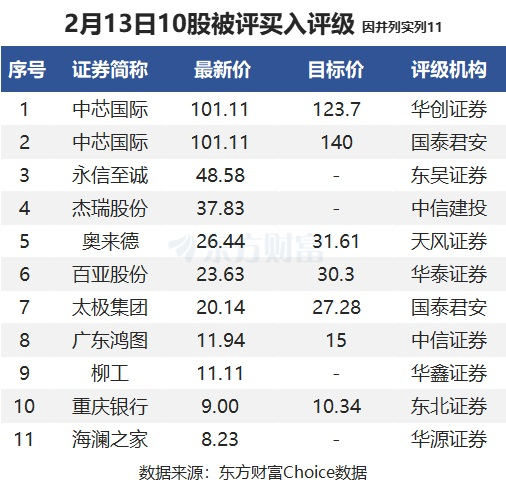 东方财富Choice数据显示,截至2月13日19点,当天有10股被券商评为买入评级,包括中芯国际、百亚股份、太极集团、柳工、海澜之家等股票,其中中芯国际被2家券商评为买入评级。