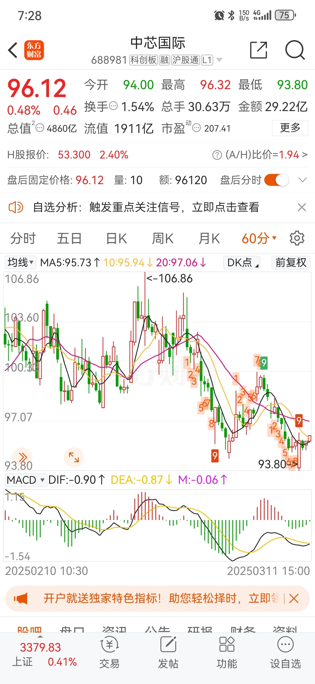 $中芯国际(SH688981)$ 明天10点半收红即可确定60分钟底背离,是一个不错的加仓点,上升周期至少6天。
