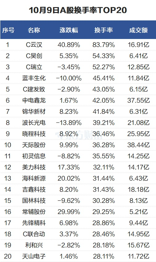 当天换手率最高的个股为C云汉,全天换手率83.79%。C昊创紧随其后,全天换手率54.33%。