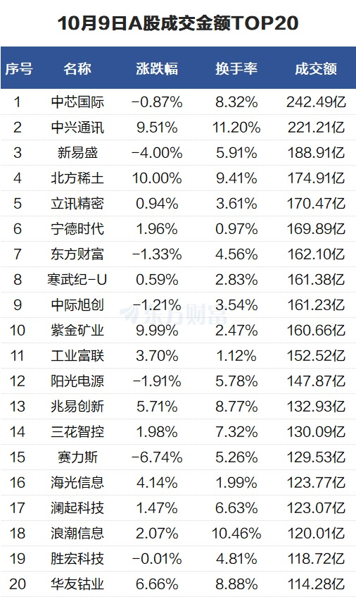 沪深两市成交额2.65万亿元,较上一交易日放量4718亿元。个股方面,中芯国际当日成交242.49亿元。中兴通讯当日成交221.21亿元。
