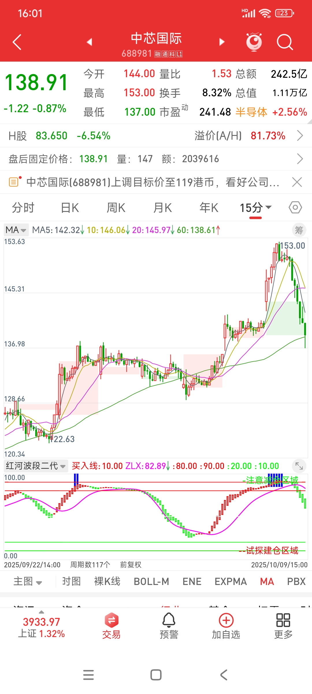 $中芯国际(SH688981)$ 中芯国际要不要开始正式回调主要看明天,今天冲高回落本质就是15分钟级别在顶部出现红柱转绿柱的情况,日线目前已经缩短到红柱随时转绿柱,所以明天就要看15分钟级别会不会带动日线级别红柱转绿柱了,转绿柱则回调开始,这里就注意风险吧。