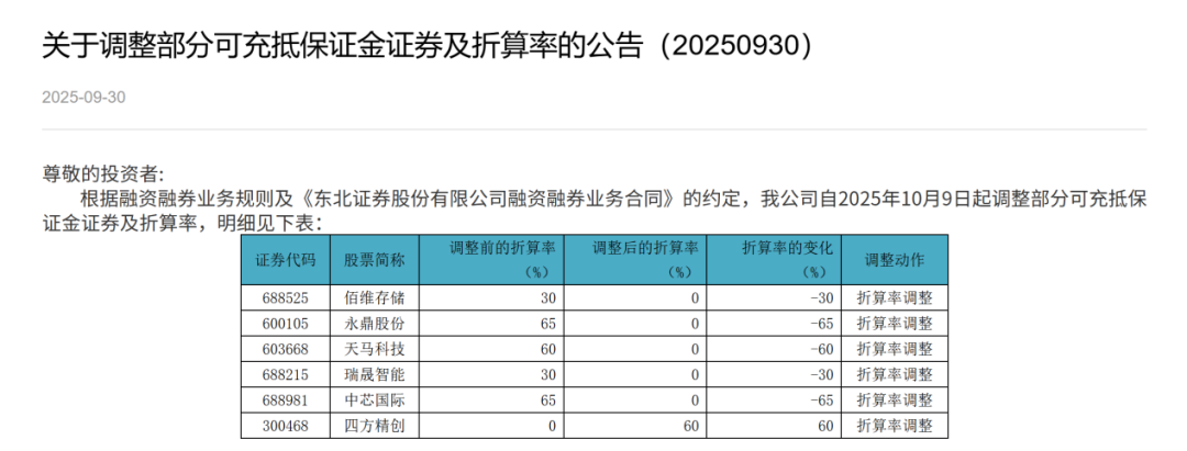记者注意到,早在9月30日,包括东北证券、红塔证券在内的多家券商已经将中芯国际、佰维存储等多只股票的可充抵保证金证券及折算率进行了调整。