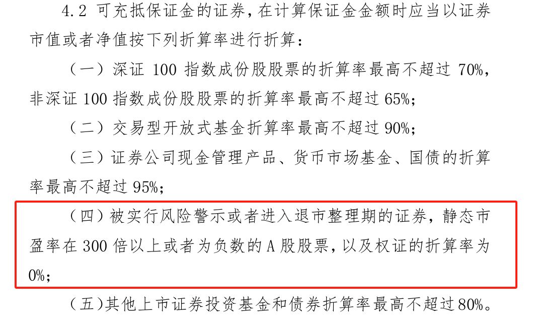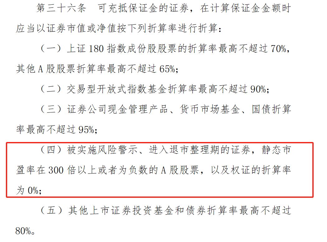 而上述调整均源自沪深交易所的相关规则。沪深交易所发布的《融资融券交易实施细则(2023年修订)》均明文规定,静态市盈率在300倍以上或者为负数的A股股票,以及权证的折算率为0%。