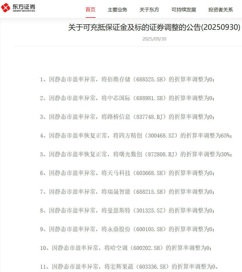 无独有偶,东方证券在官网公布的《关于可充抵保证金及标的证券调整的公告(20250930)》显示,自2025年10月9日生效的调整中,同样将佰维存储、中芯国际、路桥信息、天马科技、瑞晟智能、曼恩斯特、永鼎股份、哈空调、宏辉果蔬等9股的折算率调整为零。