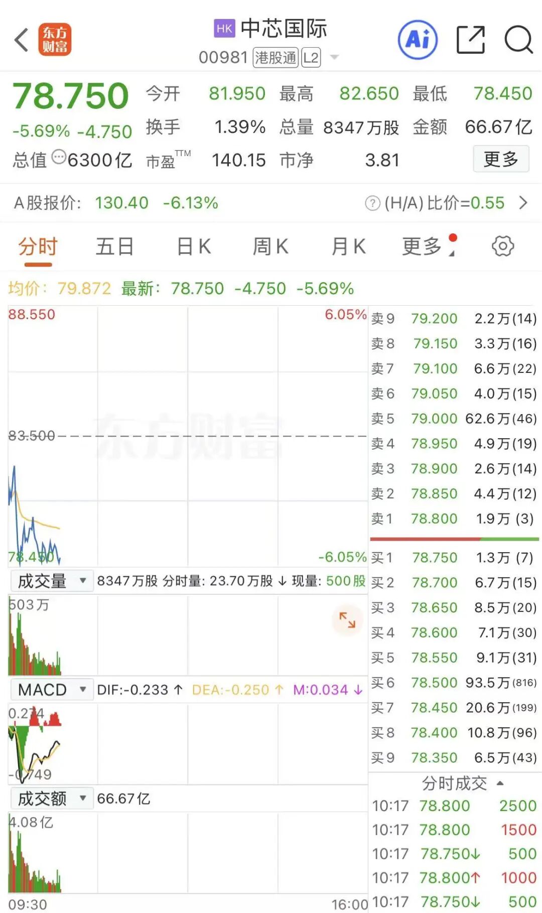 个股方面,中芯国际A股低开低走,截至发稿,跌超6%。10月9日,中芯国际午后大跳水,盘中跌幅超过10%。