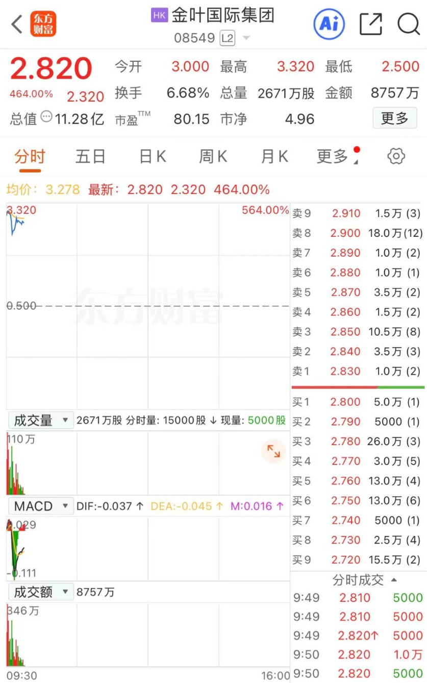 港股金叶国际集团IPO上市首日开盘大涨,截至发稿,涨464%,报2.82港元/股。10月9日,港股新股金叶国际集团暗盘一度涨超800%。金叶国际集团此次公开发售部分获超额认购逾9030倍,成为港股史上超额认购倍数最高的新股。