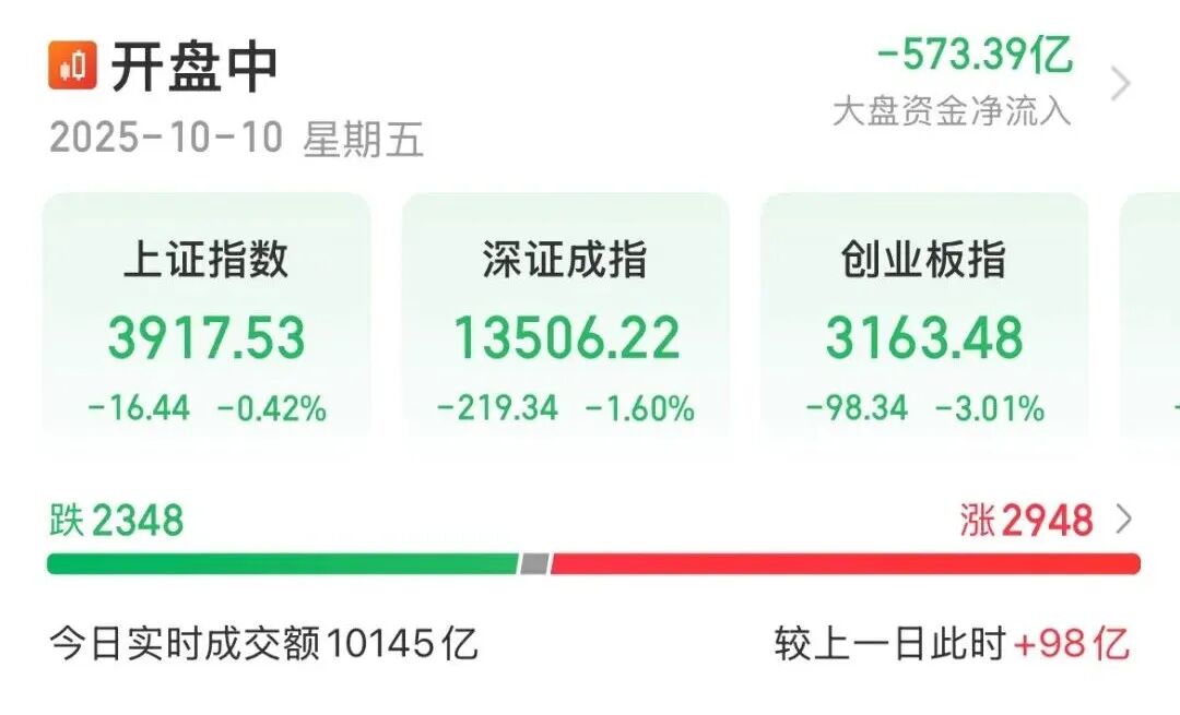 10月10日早盘,三大股指低开,沪指跌0.47%,深证成指跌0.67%,创业板跌0.96%。