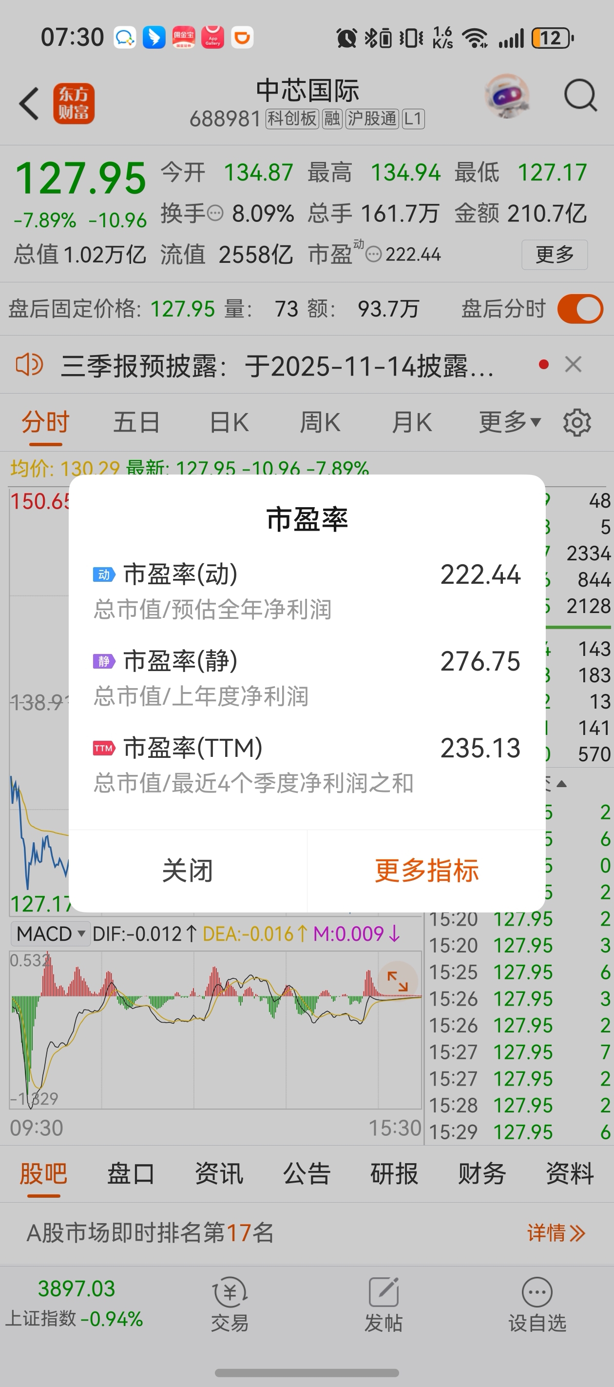 $中芯国际(SH688981)$ 静态市盈率又回到300以内了,根据规则没问题