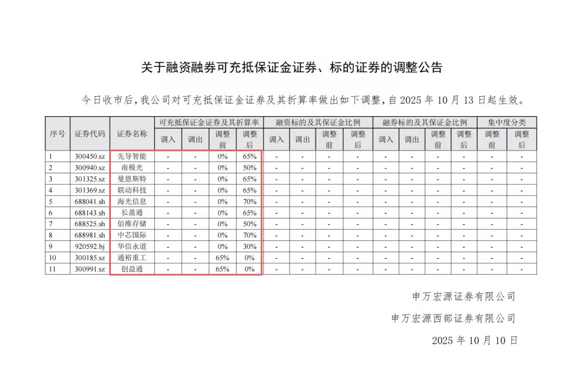 根据申万宏源证券、申万宏源西部证券公告,今日收市后调整融资融券可充抵保证金证券及折算率,自10月13日起生效。其中,先导智能、南极光、曼恩斯特、联动科技、海光信息、长盈通、佰维存储、中芯国际、华信永道等的可充抵保证金证券折算率由0%上调至30%-70%不等,就在10月9日,佰维存储、中芯国际等在上一交易日被多家券商将折算率调为零。而通裕重工、创益通两股的折算率则由65%下调至0%。根据交易所规定,个股静态市盈率如果超过300倍,或者负数的情况下,融资融券折算率就会被调为零。昨天被券商将折算率调到0,中芯国际、佰维存储这些芯片股就开始回落,今天更是暴跌近8%和10%,今天跌完折算率又调回来了,散户被玩弄的,成了Play的一环。