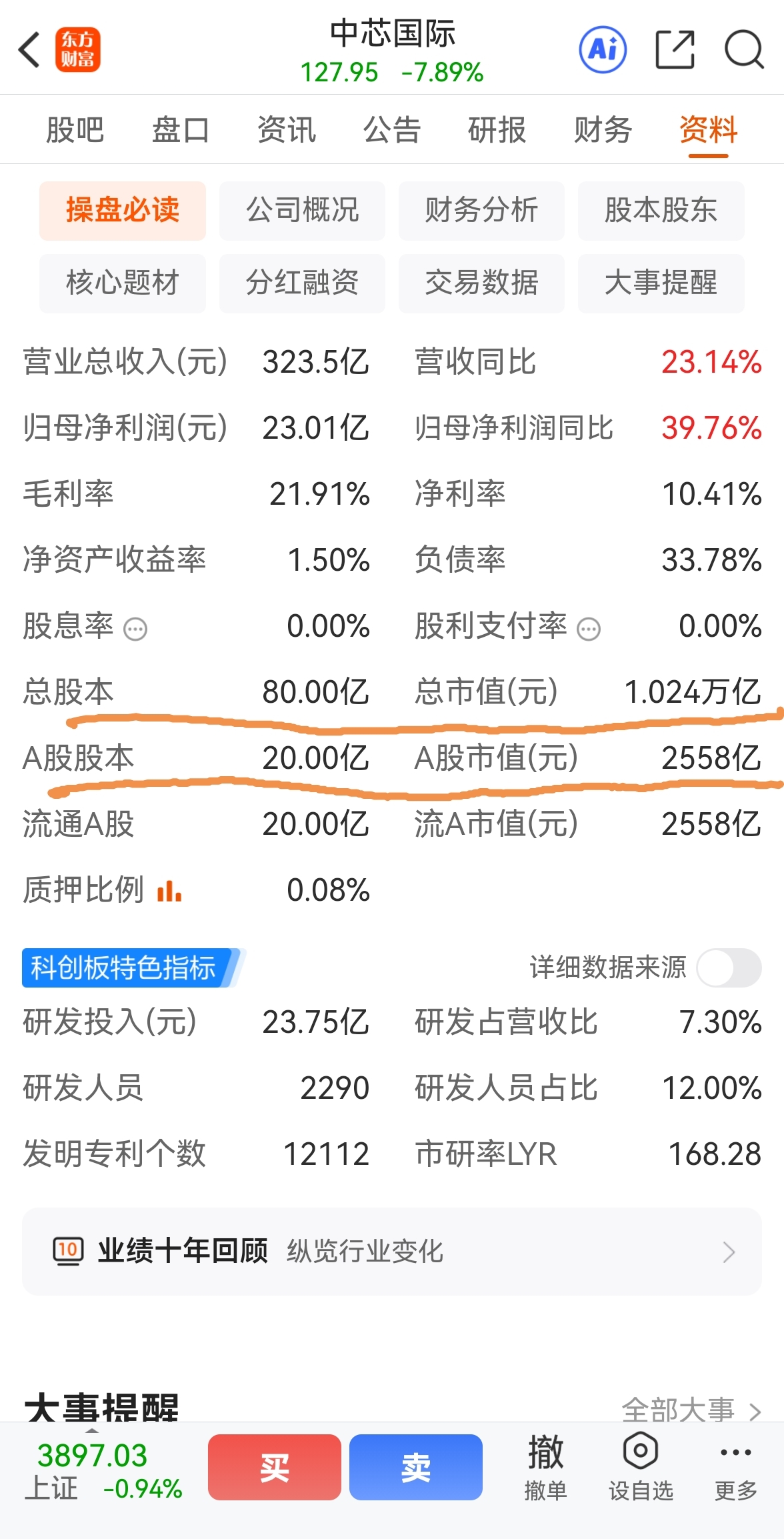 中芯国际A股市值目前仅有2500亿,距离A股市值1万亿,还有3倍空间,中芯加油,