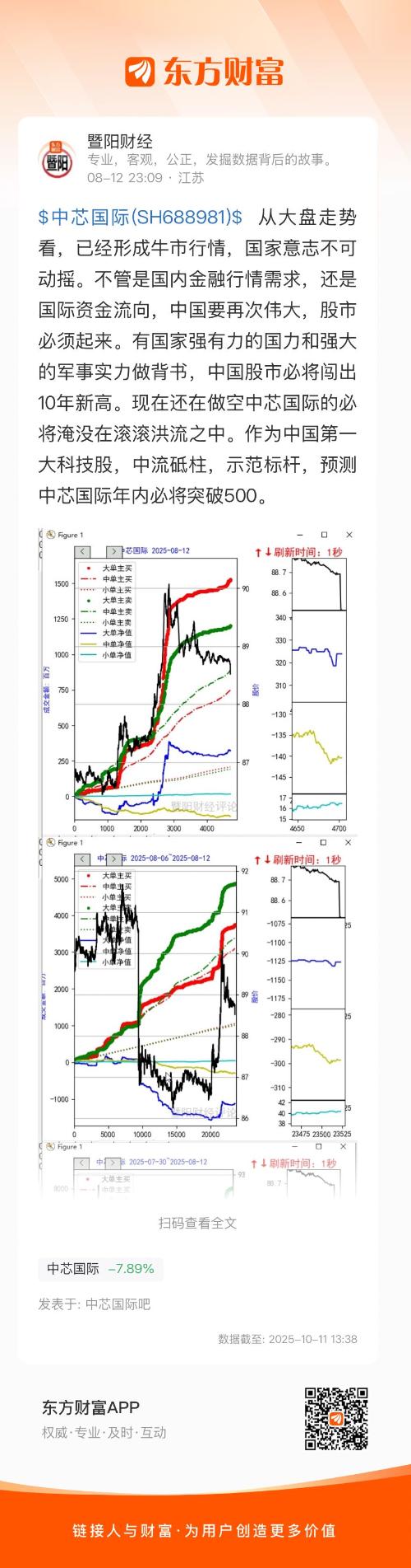$中芯国际(SH688981)$ 从大盘走势看,已经形成牛市行情,国家意志不可动摇。不管是国内金融行情需求,还是国际资金流向,中国要再次伟大,股市必须起来。有国家强有力的国力和强大的军事实力做背书,中国股市必将闯出10年新高。现在还在做空中芯国际的必将淹没在滚滚洪流之中。作为中国第一大科技股,中流砥柱,示范标杆,预测中芯国际年内必将突破500。