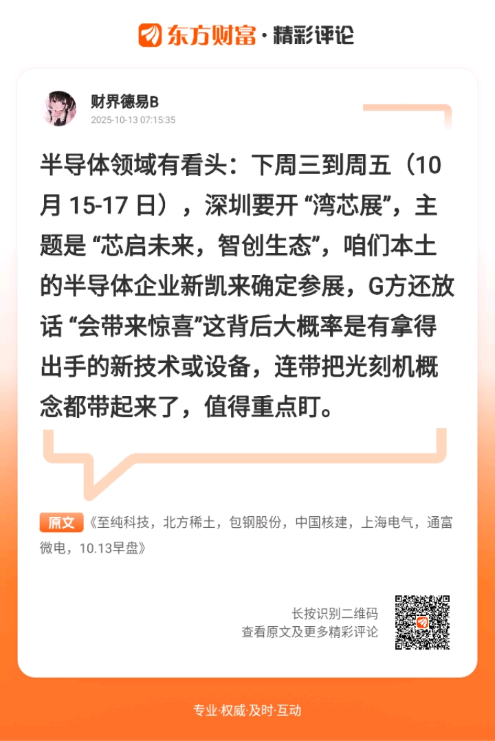 //@财界德易B :半导体领域有看头:下周三到周五(10 月 15-17 日),深圳要开 “湾芯展”,主题是 “芯启未来,智创生态”,咱们本土的半导体企业新凯来确定参展,G方还放话 “会带来惊喜”这背后大概率是有拿得出手的新技术或设备,连带把光刻机概念都带起来了,值得重点盯。 $中芯国际(SH688981)$$北方华创(SZ002371)$$长电科技(SH600584)$