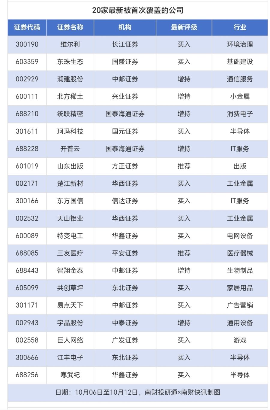首次覆盖方面,10月6日至10月12日券商共给出了36次首次覆盖,其中维尔利获得长江证券给予“买入”评级,东珠生态获得国盛证券给予“买入”评级,润建股份获得中邮证券给予“增持”评级,北方稀土获得兴业证券给予“增持”评级,统联精密获得国泰海通证券给予“增持”评级。