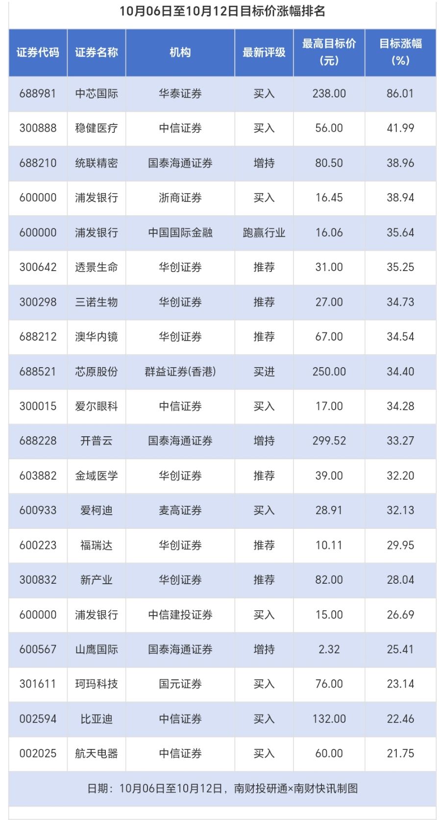 南财投研通数据显示,10月6日至10月12日,券商给予上市公司目标价共35次,按最新收盘价计算,目标价涨幅排名居前的公司有中芯国际、稳健医疗、统联精密,目标价涨幅分别为86.01%、41.99%、38.96%,分别属于半导体、个护用品、消费电子行业。