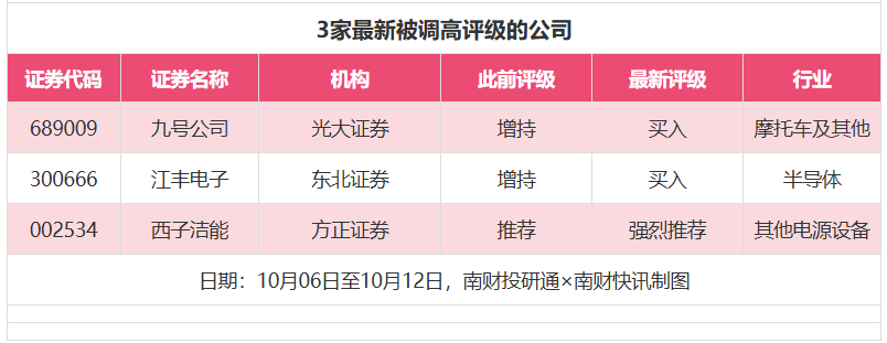 评级调高方面,10月6日至10月12日,券商调高上市公司评级达到3家次,最新数据包括了光大证券对九号公司的评级从“增持”调高至“买入”,东北证券对江丰电子的评级从“增持”调高至“买入”,方正证券对西子洁能的评级从“推荐”调高至“强烈推荐”。