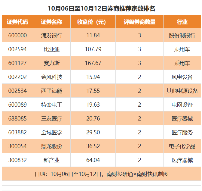 从券商推荐家数来看,10月6日至10月12日有128家上市公司得到券商推荐,其中浦发银行、比亚迪、赛力斯均获得3家推荐。