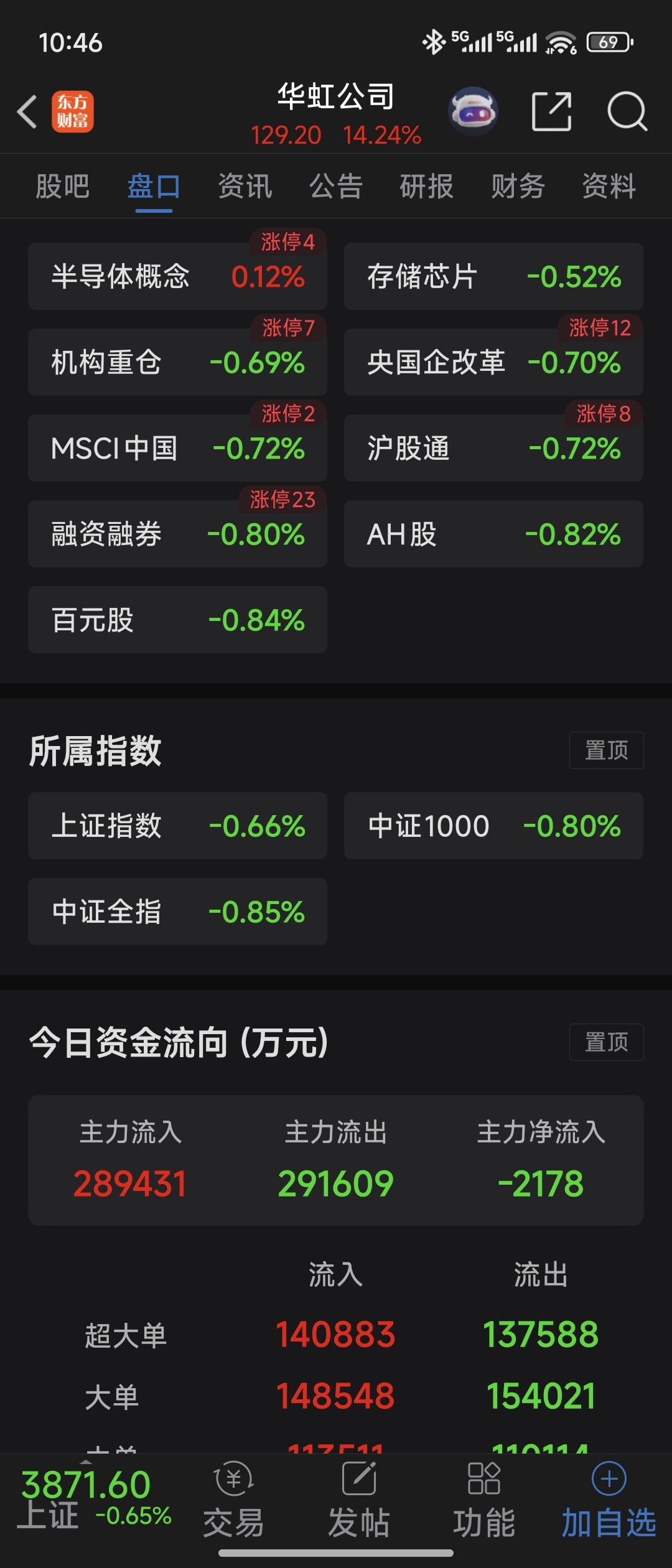 华虹公司股票卖出资金二千多万股票涨14%,你股票买入资金四亿多股票才涨5%??