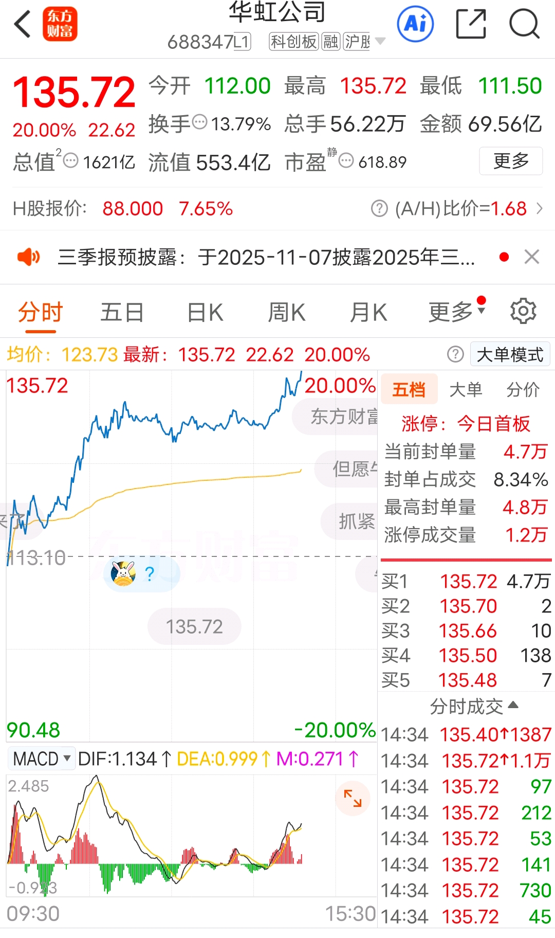 华虹已经封板了,中芯国际明天涨停板?