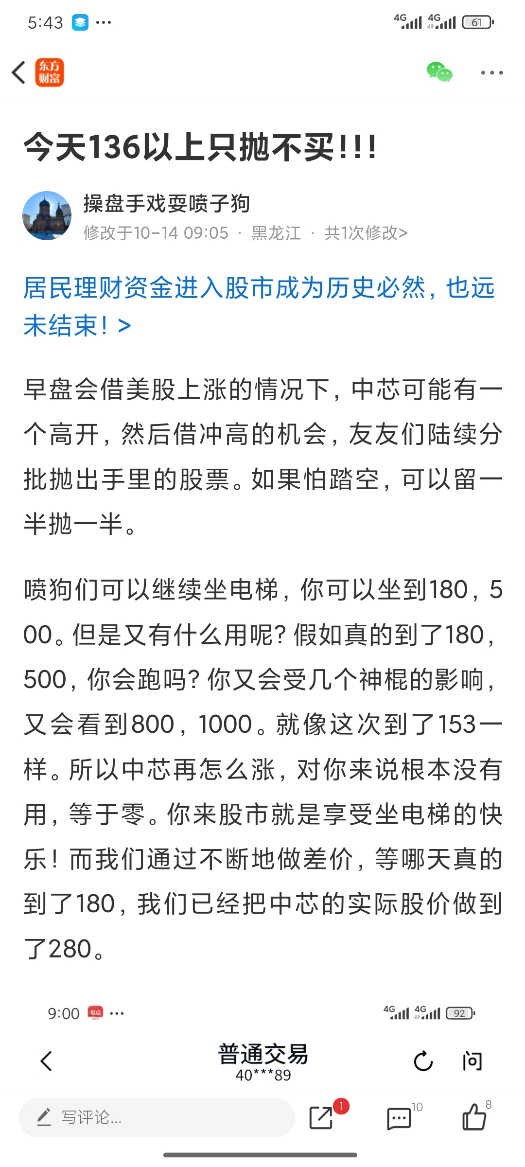中芯在前天涨得那么好的情况下,有多少人能够想到今天会大跌?本人在开盘以前就发帖说今天136以上只能跑不能买!有几个人会这么预测?这就是操盘水平,喷狗们不要不服。你们要是跟着我做差价,账户里面不知道会多出多少钱,而股票一股没少。这又不是。第一次看看前几年的操作。基本都正确。有时间可以翻看一下,我几天前的那些帖子。近阶段这三轮差价做下来。已经累计近三十块。