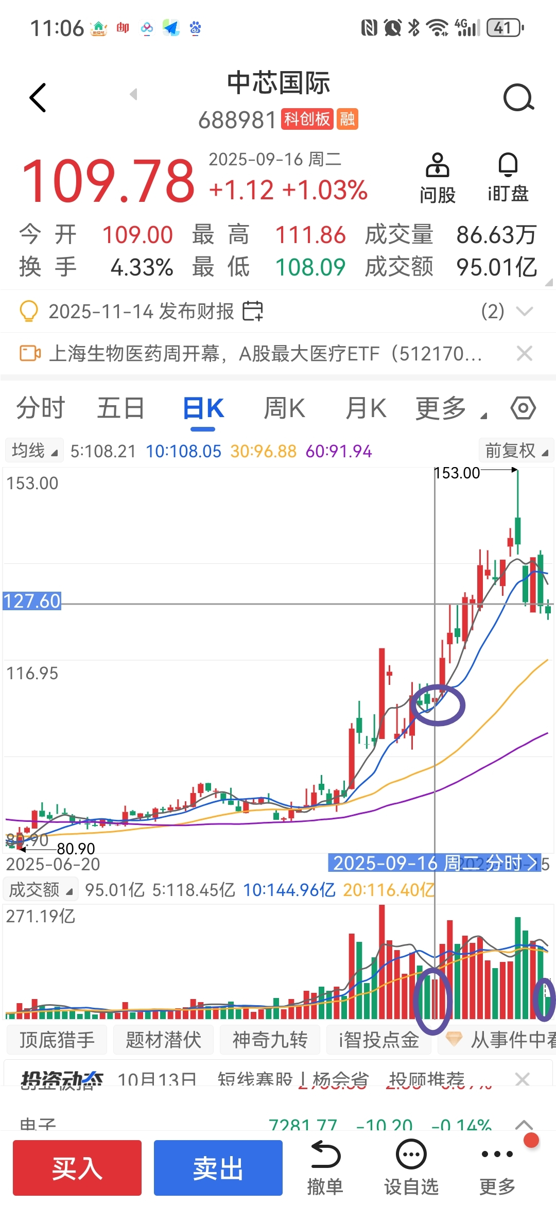 今天,中芯国际严重缩量调整对应的点位看下图,不出意外的话,就是新的一波主升浪的前